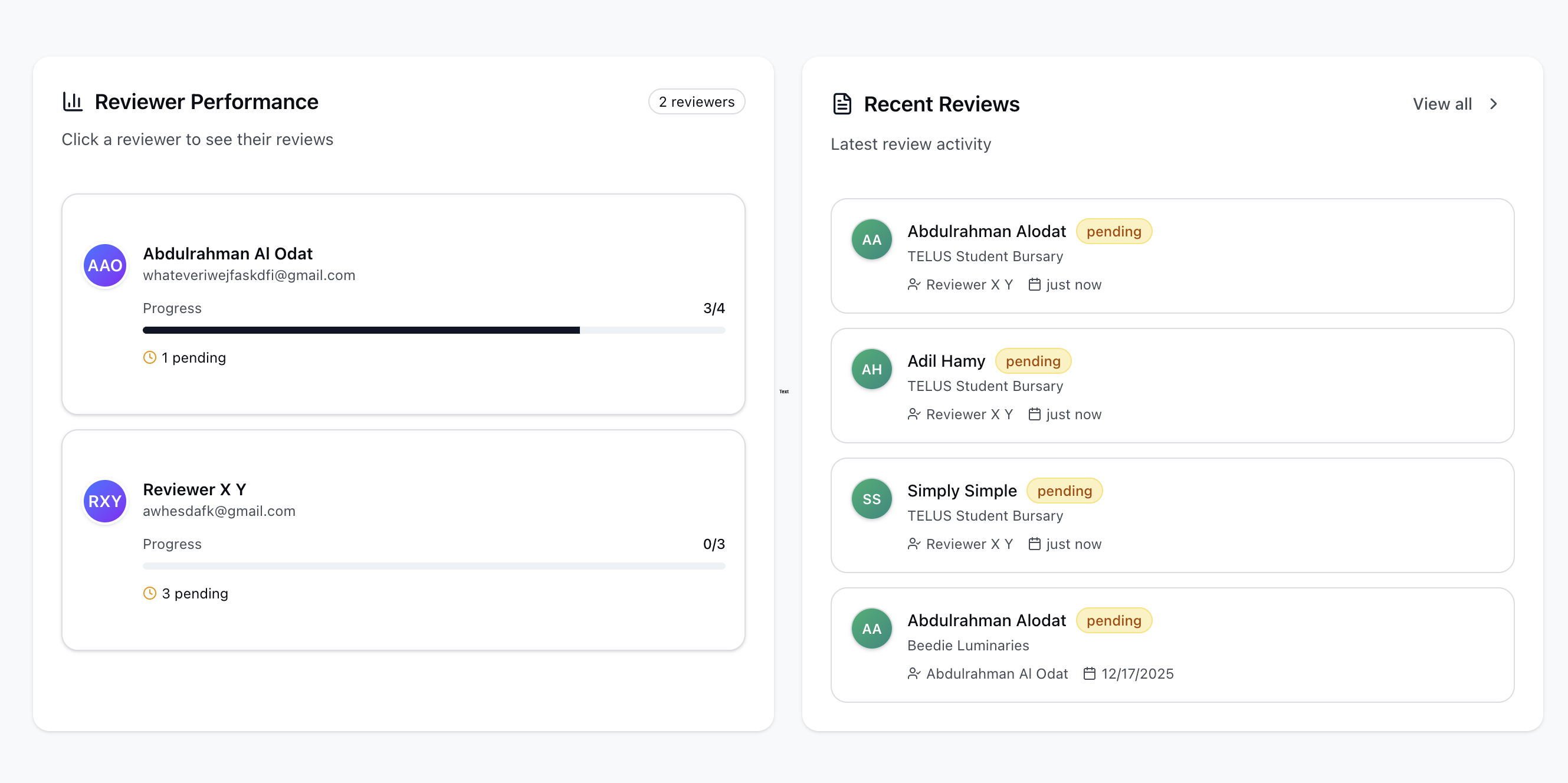 Assign applications to your review committee with confidence. Track progress, ensure fair scoring, and manage the entire review workflow from one dashboard.