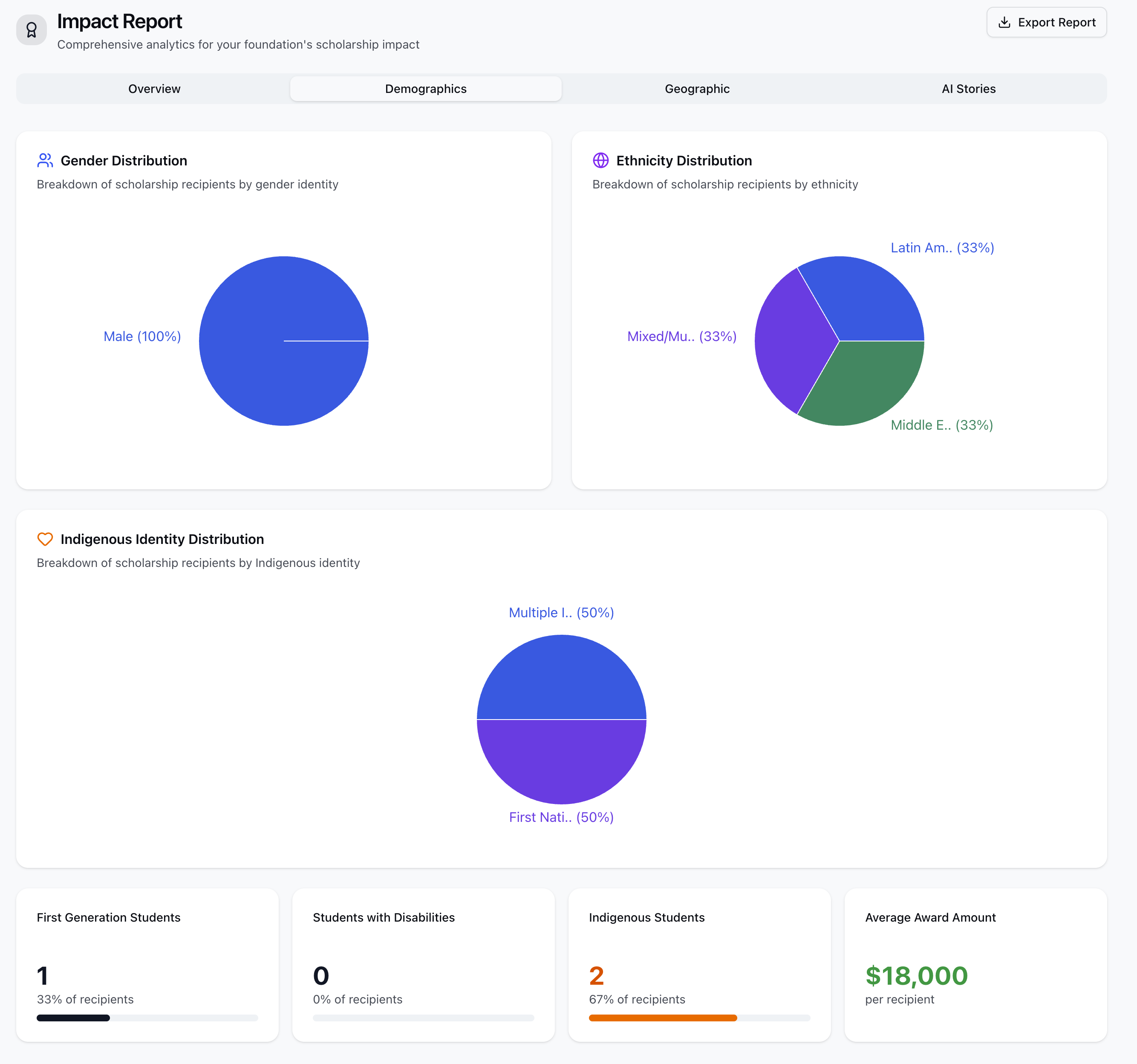 Track applicant demographics, analyze trends, and generate reports for stakeholders. Understand your applicant pool with beautiful visualizations.